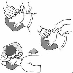 實施心肺復(fù)蘇時,首先用拳頭有節(jié)奏地用力叩擊患者前胸左乳頭內(nèi)側(cè)的心臟部位2~3次,拳頭抬起時,離胸部20~30厘米,以掌握叩擊的力量。若脈搏仍未恢復(fù)搏動,應(yīng)立即連續(xù)做4次口對口人工呼吸,接著再做胸外心臟按壓。一人施行心肺復(fù)蘇時,每做15次心臟按壓,再做次人工呼吸。兩人合作進行心肺復(fù)蘇時,先連做4次人工呼吸,隨后,一人連續(xù)做5次心臟按壓后停下,另一人做一次人工呼吸。